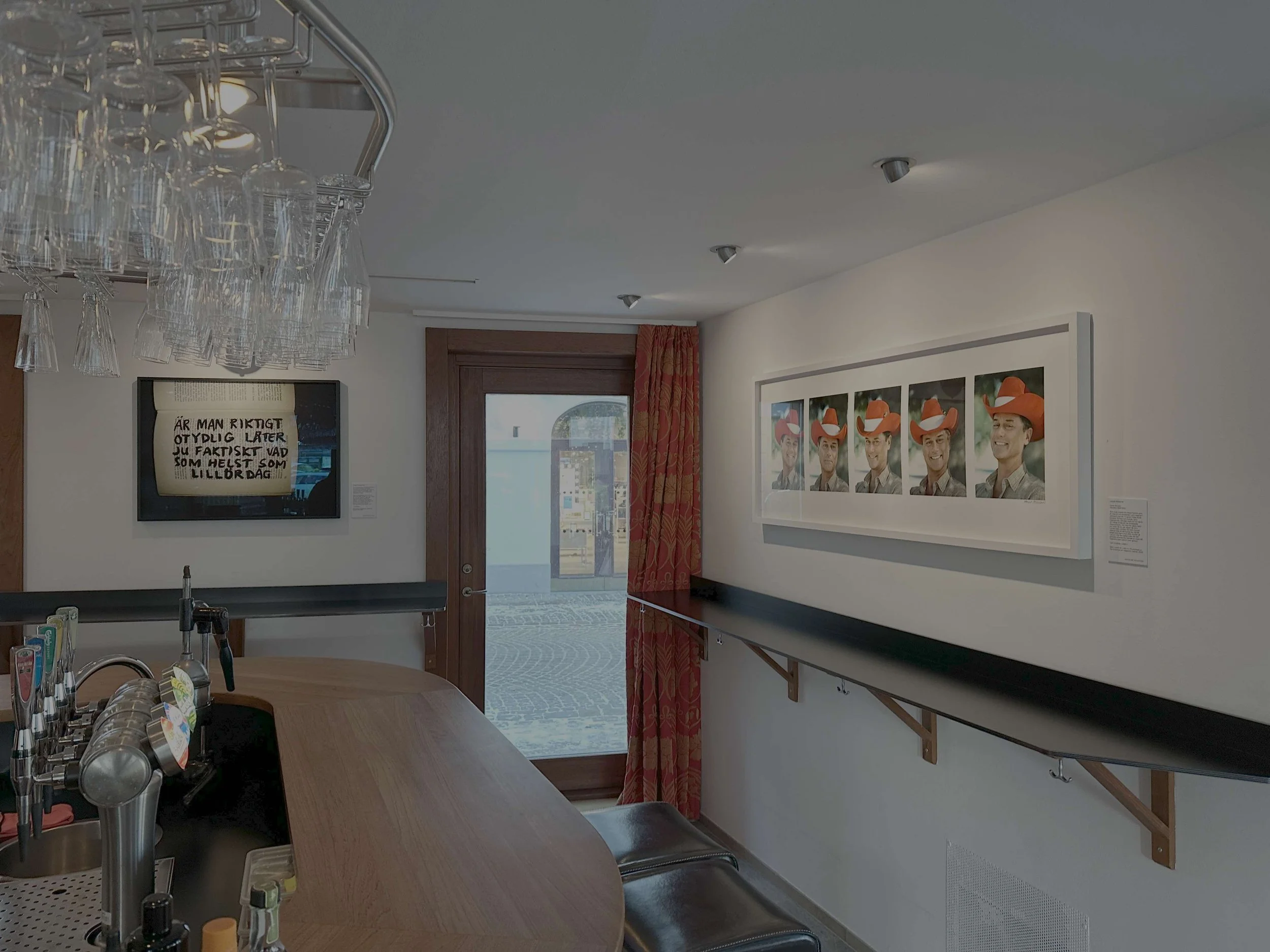 In this room, two distinct artistic voices meet. On the left, Jesper Waldersten. On the right, Hasse Persson’s iconic series Say Cheese – Larry.
