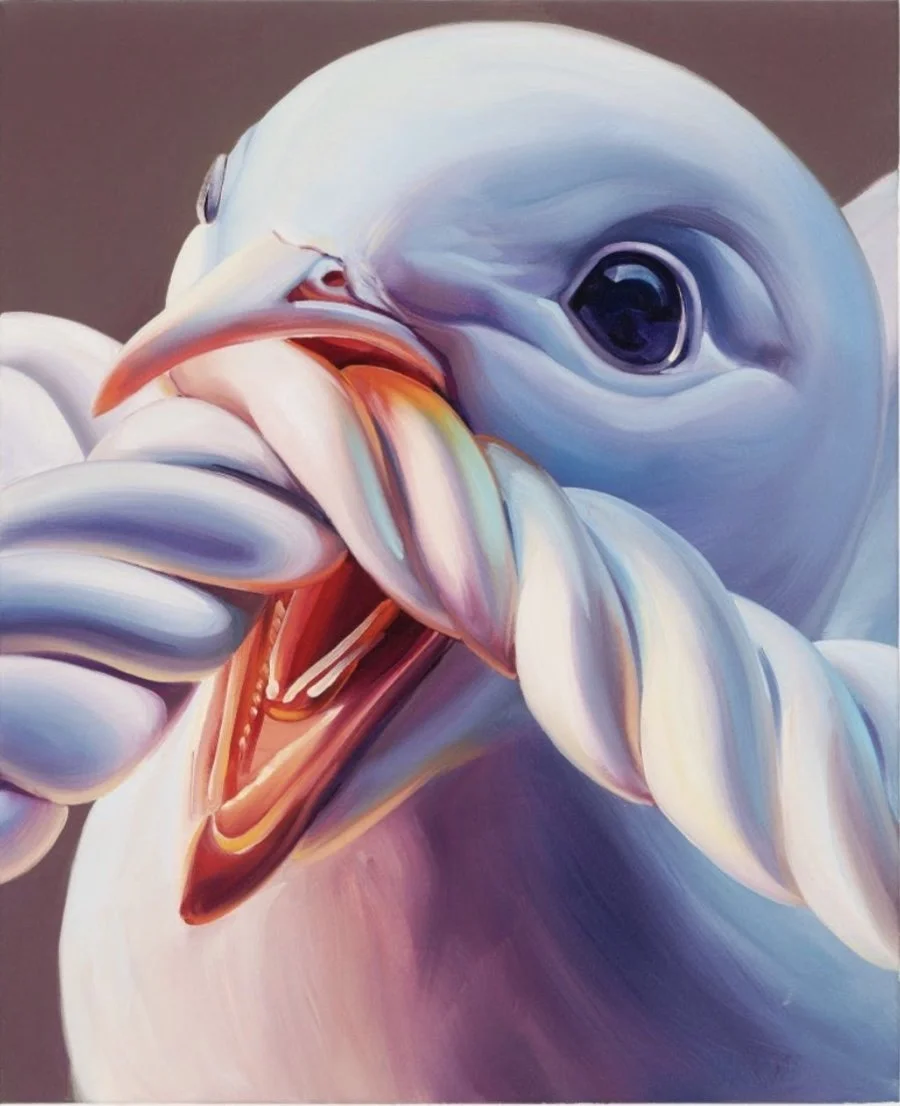 Gothenburg-based artist Malin Molin works at the intersection of hyperrealism and contemporary image culture. In this painting, part of the Avalon Hotel Art Collection, we encounter a white dove in extreme close-up — its beak open, gripping a twisted, marshmallow-like form. The image is immediate, almost iconic, yet charged with subtle tension.